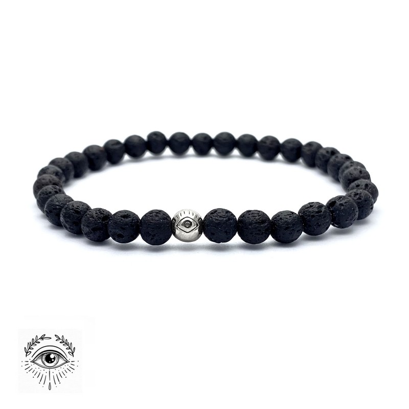 Eye bracelet in black lava rock 6mm - Natural gemstone and silver bead