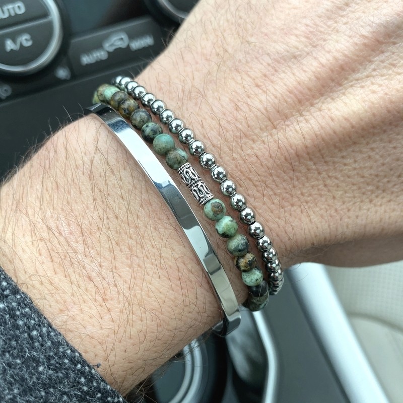 Pack de bracelets Homme, 1 Jonc acier + 2 bracelets en perles Ø 4 mm (Pierre jaspe africain vert et hématite)
